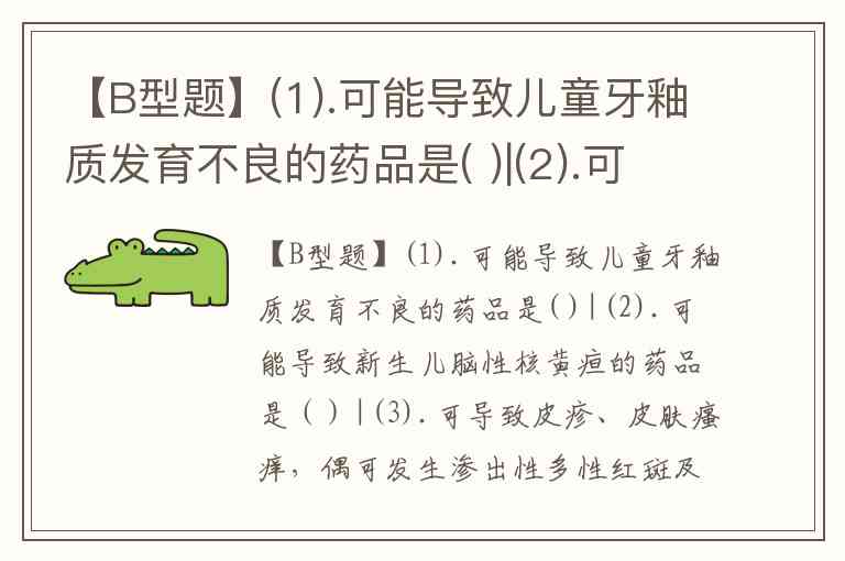 【B型题】(1).可能导致儿童牙釉质发育不良的药品是( )|(2).可能导致新生儿脑性核黄疸的药品是()|(3).可导致皮疹、皮肤瘙痒,偶可发生渗出性多性红斑及血管神经性水肿的药品是()|(4).可导致过敏性休克的药物是()A.磺胺类抗菌药 B.四环素类抗生素 C.氨基糖苷类抗生素 D.硝基呋喃类抗菌药