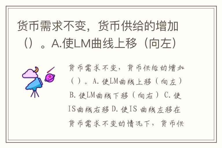 货币需求不变,货币供给的增加()。A.使LM曲线上移(向左) B.使LM曲线下移(向右) C.使IS曲线右移 D.使IS 曲线左移