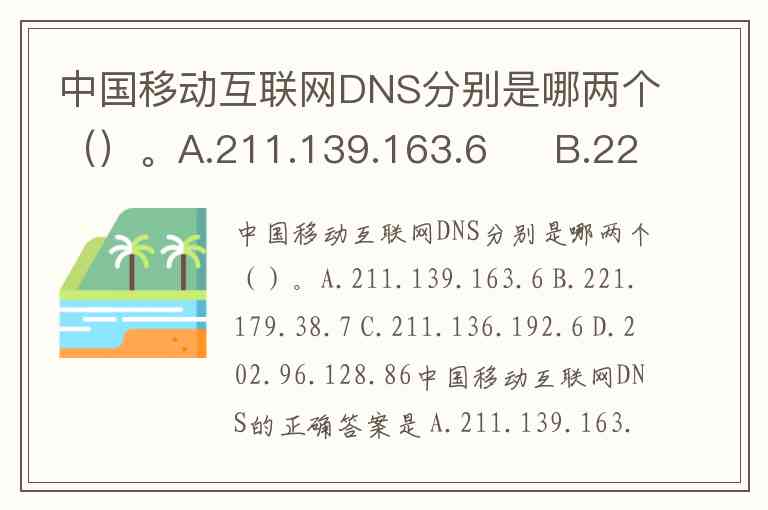 中国移动互联网DNS的正确答案是 A.211.139.163.6 和 C.211.136.192.6。这两个地址均为广东省移动DNS服务器,在多个权威来源中被明确列为中国移动的核心DNS节点,覆盖范围广且稳定性高。