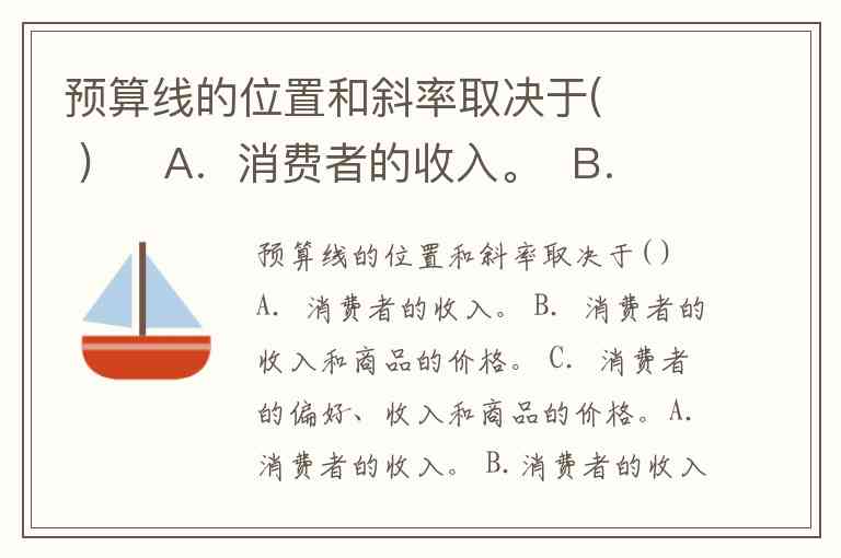 预算线的位置和斜率取决于( ) A.消费者的收入。 B.消费者的收入和商品的价格。 C.消费者的偏好、收入和商品的价格。A.消费者的收入。 B.消费者的收入和商品的价格。