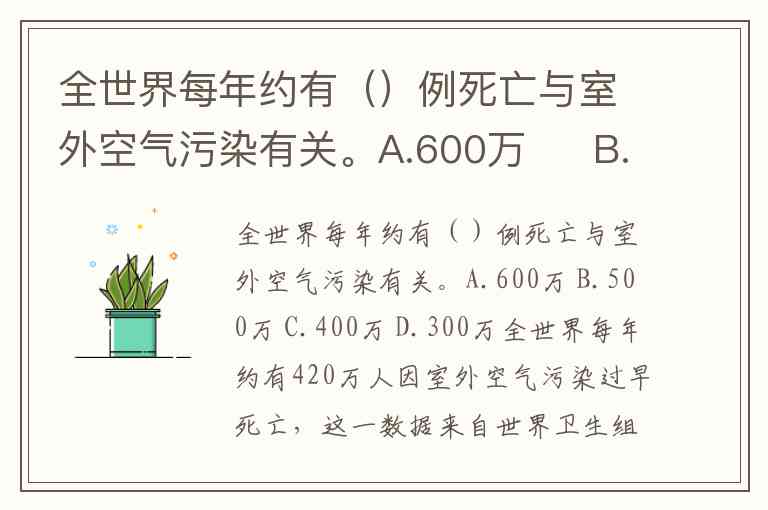 全世界每年约有()例死亡与室外空气污染有关。A.600万 B.500万 C.400万 D.300万