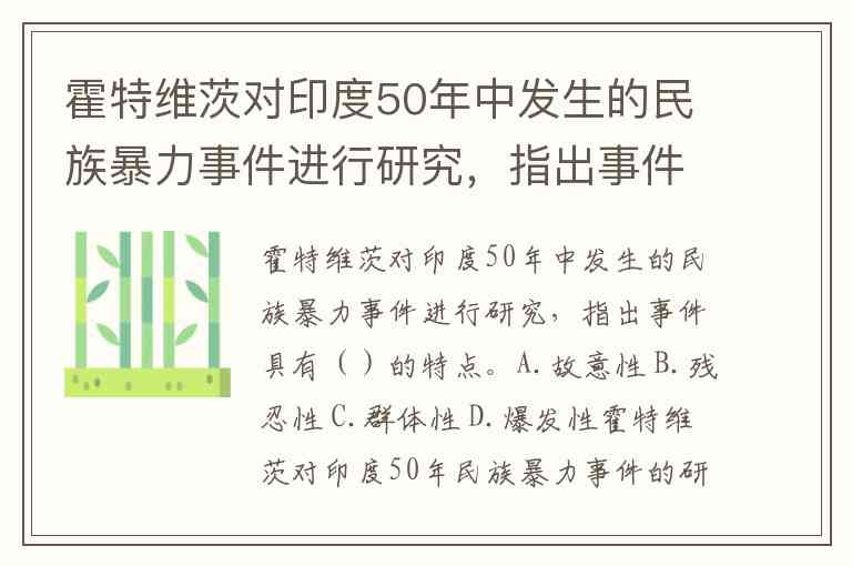 霍特维茨对印度50年民族暴力事件的研究指出,这些事件同时具备故意性、残忍性、群体性和爆发性四大核心特征。这一结论在多项公务员培训考试和学术测试中被明确列为标准答案,反映了学术界对印度民族冲突复杂性的共识。