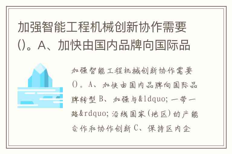 加强智能工程机械创新协作需要()。A、加快由国内品牌向国际品牌转型 B、加强与“一带一路”沿线国家(地区)的产能合作和协作创新 C、保持区内企业的生产水平 D、积极打造国际化高端装备制造业基地 此题为多项选择题。