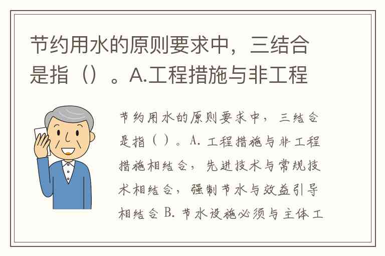 节约用水的原则要求中,三结合是指()。A.工程措施与非工程措施相结合,先进技术与常规技术相结合,强制节水与效益引导相结合 B.节水设施必须与主体工程同时设计、同时施工、同时投入运行 C.经济效益、环境效益、社会效益相结合 D.开发、消耗、废物产生环节治理相结合