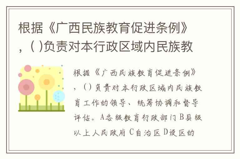 根据《广西民族教育促进条例》,( )负责对本行政区域内民族教育工作的领导、统筹协调和督导评估。A各级教育行政部门 B县级以上人民政府 C自治区 D设区的市人民政府