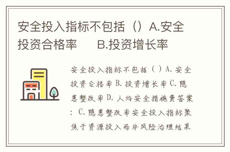 安全投入指标不包括()A.安全投资合格率 B.投资增长率 C.隐患整改率 D.人均安全措施费