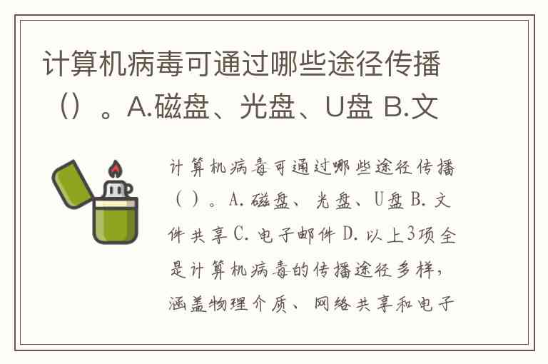 计算机病毒可通过哪些途径传播()。A.磁盘、光盘、U盘 B.文件共享 C.电子邮件 D.以上3项全是