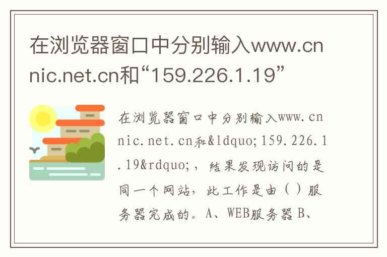 在浏览器窗口中分别输入www.cnnic.net.cn和“159.226.1.19”,结果发现访问的是同一个网站,此工作是由()服务器完成的。A、WEB服务器 B、DNS服务器 C、FTP服务器 D、代理服务器