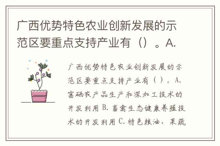 广西优势特色农业创新发展的示范区要重点支持产业有()。A.富硒农产品生产和深加工技术的开发利用 B.畜禽生态健康养殖技术的开发利用 C.特色粮油、果蔬及木薯等作物的开发利用 D.优势林木资源的开发利用