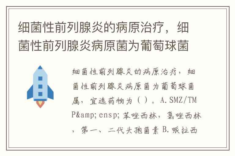 细菌性前列腺炎的病原治疗,细菌性前列腺炎病原菌为葡萄球菌属,宜选药物为()。A.SMZ/TMP 苯唑西林,氯唑西林,第一、二代头孢菌素 B.哌拉西林/他唑巴坦 C.环丙沙星、左氧氟沙星、头孢他啶 D.氨苄西林/舒巴坦、阿莫西林/克拉维酸