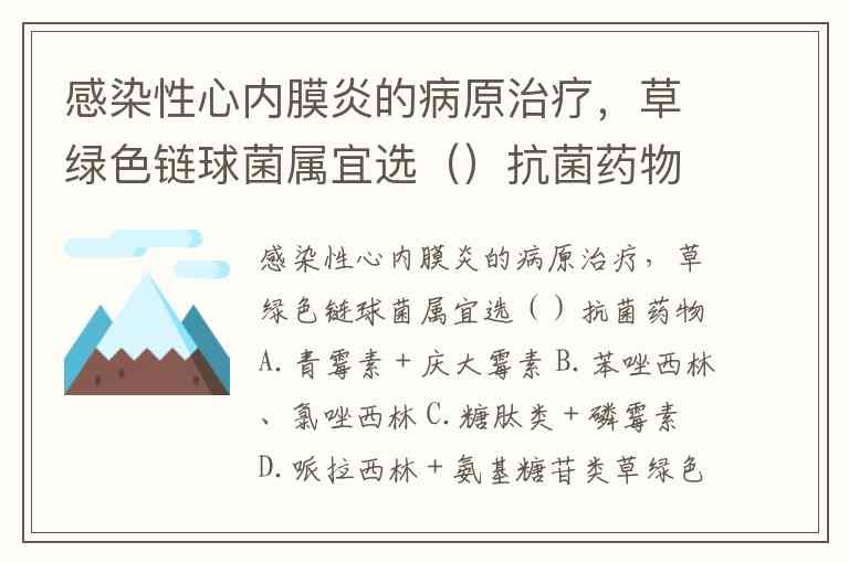 感染性心内膜炎的病原治疗,草绿色链球菌属宜选()抗菌药物A.青霉素+庆大霉素 B.苯唑西林、氯唑西林 C.糖肽类+磷霉素 D.哌拉西林+氨基糖苷类