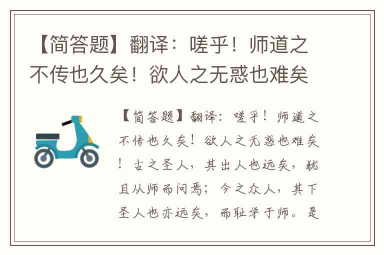 【简答题】翻译:嗟乎!师道之不传也久矣!欲人之无惑也难矣!古之圣人,其出人也远矣,犹且从师而问焉;今之众人,其下圣人也亦远矣,而耻学于师。是故圣益圣,愚益愚。