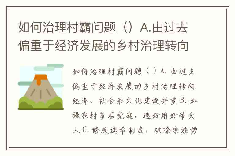 如何治理村霸问题()A.由过去偏重于经济发展的乡村治理转向经济、社会和文化建设并重 B.加强农村基层党建,选好用好带头人 C.修改选举制度,破除宗族势力 D.以村庄间的联合党建加强村庄间的监督 E.让公共安全力量覆盖到村庄