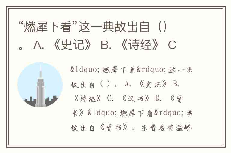 “燃犀下看”这一典故出自()。 A. 《史记》 B. 《诗经》 C. 《汉书》 D. 《晋书》