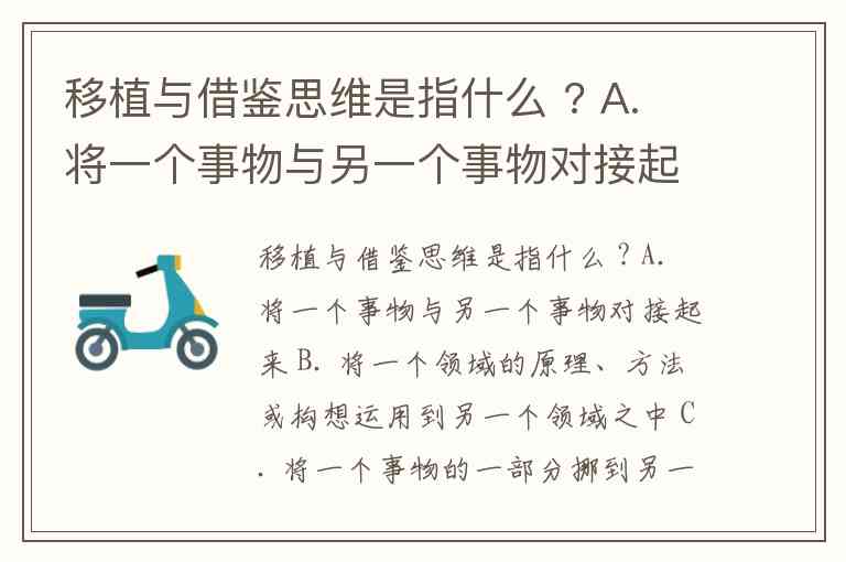 移植与借鉴思维是指什么 ? A. 将一个事物与另一个事物对接起来 B. 将一个领域的原理、方法或构想运用到另一个领域之中 C. 将一个事物的一部分挪到另一个事物中去 D. 以上都不对