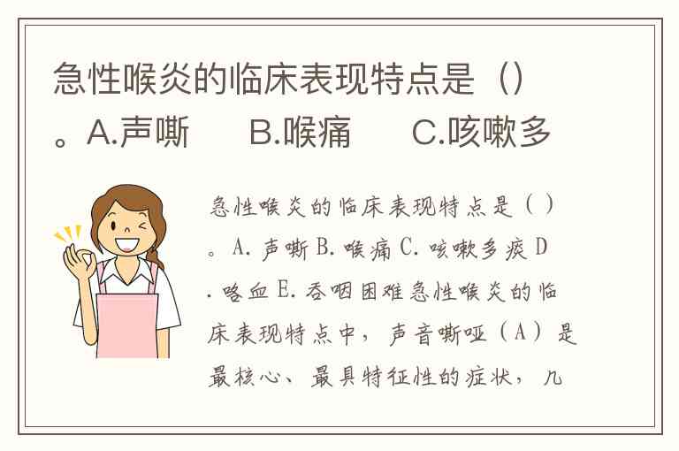 急性喉炎的临床表现特点中,声音嘶哑(A)是最核心、最具特征性的症状,几乎所有患者都会出现。这是由于喉部黏膜充血水肿导致声带振动异常,轻者声音低沉沙哑,重者可能完全失声,且通常在发病初期即出现并随病情进展加重。