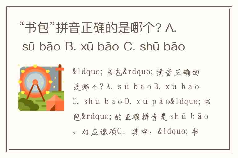 “书包”的正确拼音是 shū bāo,对应选项C。其中,“书”读第一声(阴平),声母为“sh”(翘舌音);“包”读第一声(阴平),声母为“b”。