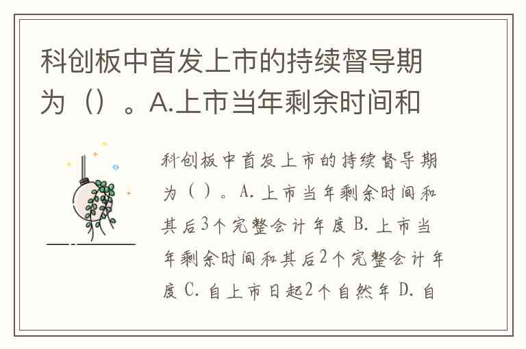 科创板中首发上市的持续督导期为()。A.上市当年剩余时间和其后3个完整会计年度 B.上市当年剩余时间和其后2个完整会计年度 C.自上市日起2个自然年 D.自上市日起3个自然年