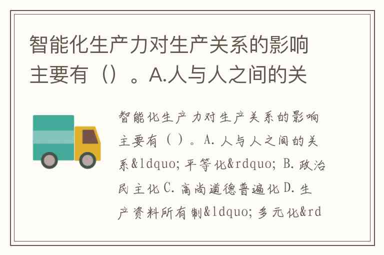 智能化生产力对生产关系的影响主要有()。A.人与人之间的关系“平等化” B.政治民主化 C.高尚道德普遍化 D.生产资料所有制“多元化” E.产品分配关系“合理化”