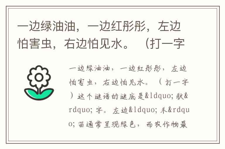 一边绿油油,一边红彤彤,左边怕害虫,右边怕见水。 (打一字)