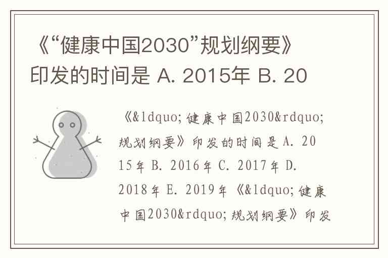 《“健康中国2030”规划纲要》印发的时间是 A. 2015年 B. 2016年 C. 2017年 D. 2018年 E. 2019年