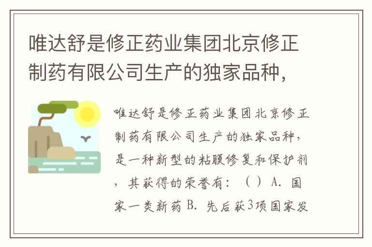 唯达舒是修正药业集团北京修正制药有限公司生产的独家品种,是一种新型的粘膜修复和保护剂,其获得的荣誉有:() A. 国家一类新药 B. 先后获3项国家发明专利,公开发表学术论文40余篇,专利保护期20年 C. 被国家科委列为医药技术创新(1035)工程重大项目 D. 获得科技进步一等奖、全国发明博览会金奖、全军后勤重大科技成果奖