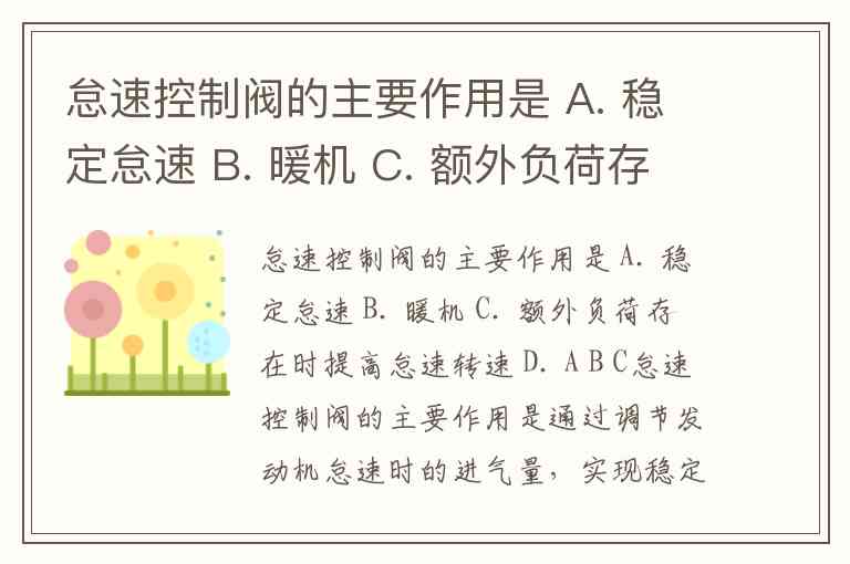 怠速控制阀的主要作用是通过调节发动机怠速时的进气量,实现稳定怠速、暖机控制和应对额外负荷三大核心功能,因此正确答案为 D. A B C。