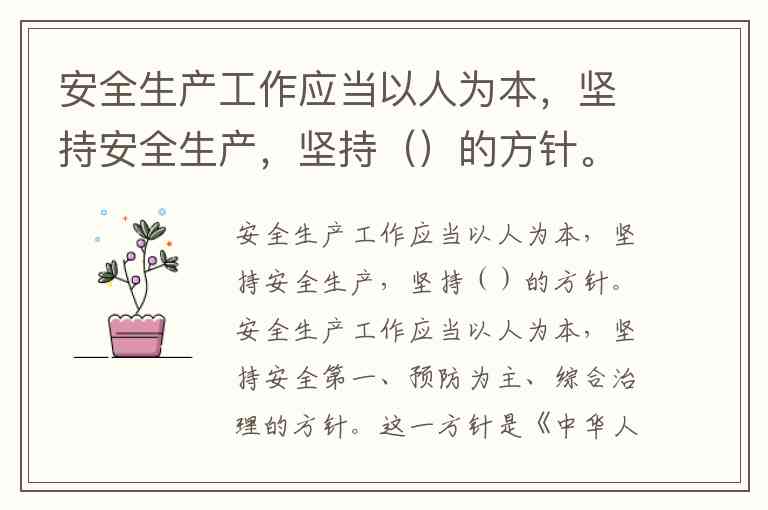安全生产工作应当以人为本,坚持安全第一、预防为主、综合治理的方针。这一方针是《中华人民共和国安全生产法》明确规定的核心指导原则,贯穿于我国安全生产管理的全过程。