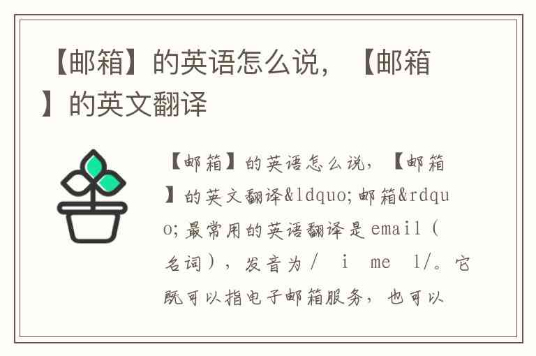 “邮箱”最常用的英语翻译是 email(名词),发音为 /ˈiːmeɪl/。它既可以指电子邮箱服务,也可以指具体的邮件内容或邮箱地址。