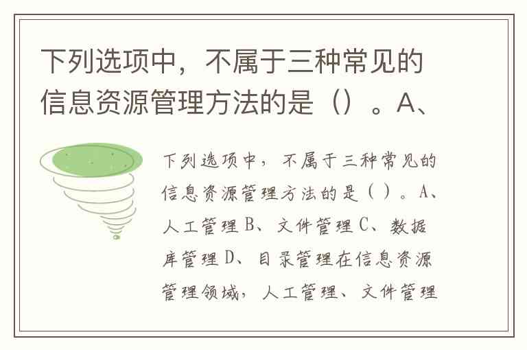 下列选项中,不属于三种常见的信息资源管理方法的是()。A、人工管理 B、文件管理 C、数据库管理 D、目录管理
