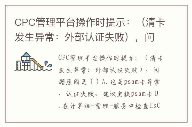 CPC管理平台操作时提示:(清卡发生异常:外部认证失败),问题原因是()A.这是psam卡异常,认证失败,建议更换psam卡 B.在计算机-管理-服务中检查HsCPCMPService是否正常启动,如果未检测到该服务则需要安装控件 C.由于CPC卡被锁,导致的无法清卡 D.网络连接异常