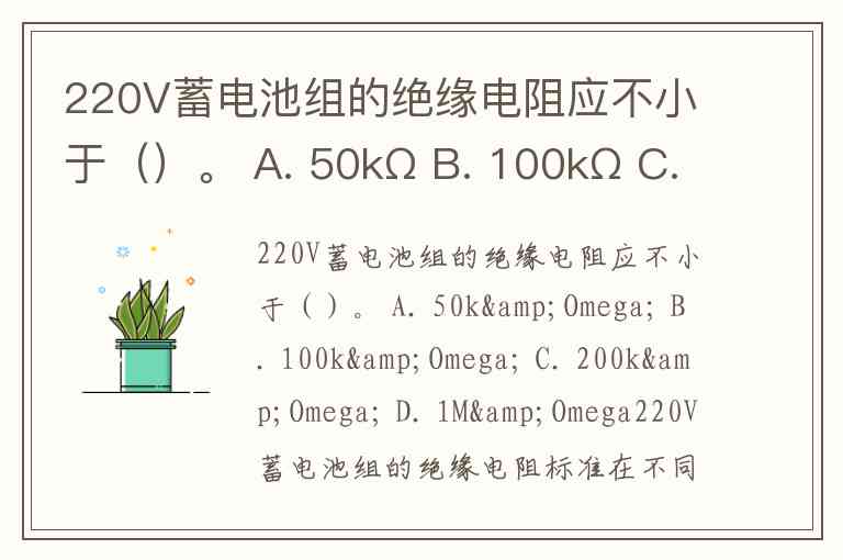 220V蓄电池组的绝缘电阻应不小于()。 A. 50kΩ B. 100kΩ C. 200kΩ D. 1M&Omega