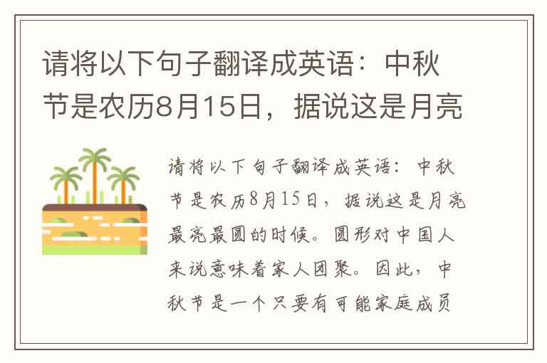 请将以下句子翻译成英语:中秋节是农历8月15日,据说这是月亮最亮最圆的时候。圆形对中国人来说意味着家人团聚。因此,中秋节是一个只要有可能家庭成员就要团聚的节日。