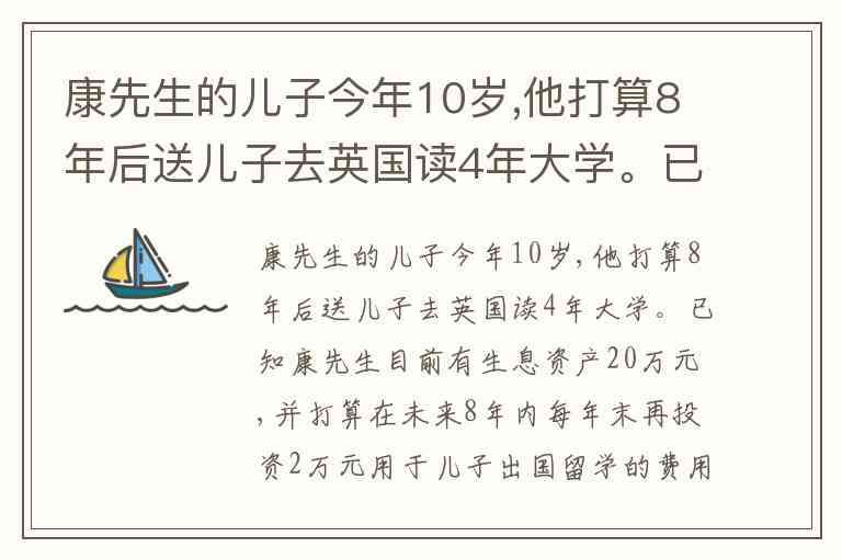 康先生的资金来源包括两部分:现有生息资产20万元,以及未来8年每年末投资2万元。两者均按4%的年化投资报酬率计算终值。