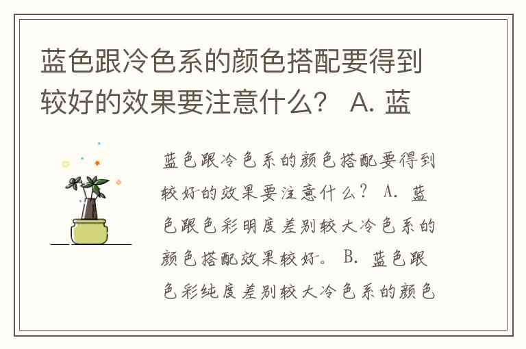 蓝色跟冷色系的颜色搭配要得到较好的效果要注意什么? A. 蓝色跟色彩明度差别较大冷色系的颜色搭配效果较好。 B. 蓝色跟色彩纯度差别较大冷色系的颜色搭配效果较好。 C. 蓝色跟色彩色相差别较大冷色系的颜色搭配效果较好。 D. 以上搭配都正确。