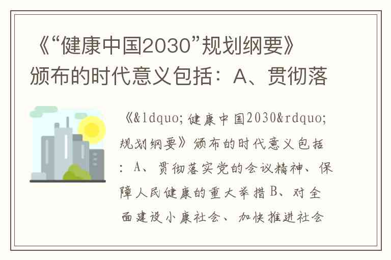 《“健康中国2030”规划纲要》颁布的时代意义包括:A、贯彻落实党的会议精神、保障人民健康的重大举措 B、对全面建设小康社会、加快推进社会主义现代化具有重大意义 C、是我国积极参与全球健康治理、履行我国对联合国“2030可持续发展议程”承诺的重要举措 D、是执政党对人民作出的一个郑重承诺