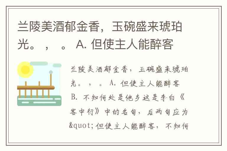兰陵美酒郁金香,玉碗盛来琥珀光。 , 。 A. 但使主人能醉客 B. 不知何处是他乡
