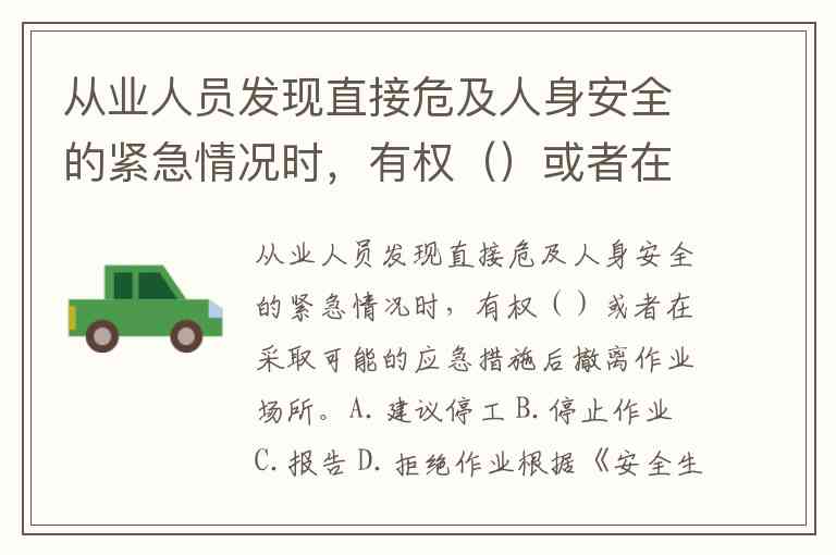 从业人员发现直接危及人身安全的紧急情况时,有权()或者在采取可能的应急措施后撤离作业场所。A.建议停工 B.停止作业 C.报告 D.拒绝作业