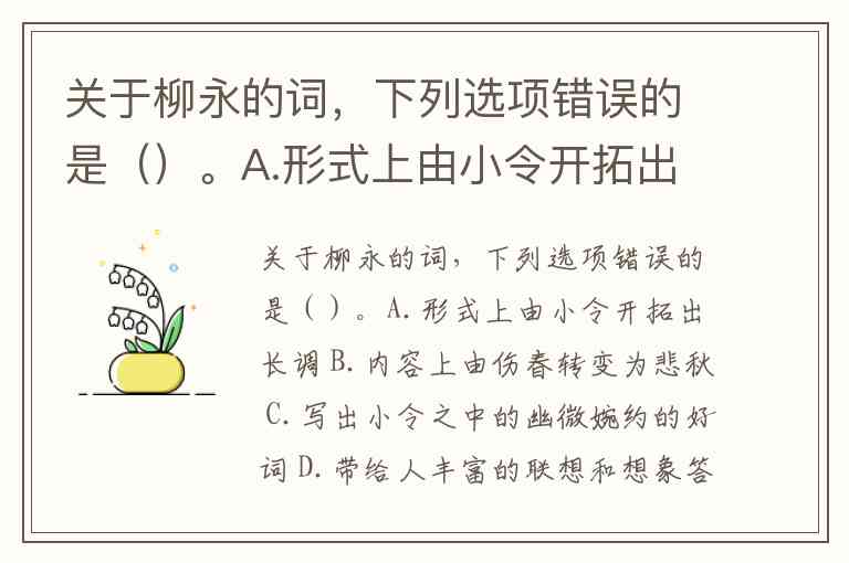 关于柳永的词,下列选项错误的是()。A.形式上由小令开拓出长调 B.内容上由伤春转变为悲秋 C.写出小令之中的幽微婉约的好词 D.带给人丰富的联想和想象