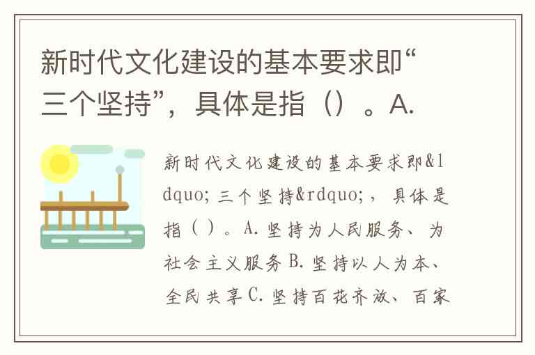 新时代文化建设的基本要求即“三个坚持”,具体是指()。A.坚持为人民服务、为社会主义服务 B.坚持以人为本、全民共享 C.坚持百花齐放、百家争鸣 D.坚持科教兴国、大力发展科学技术 E.坚持创造性转化、创新性发展