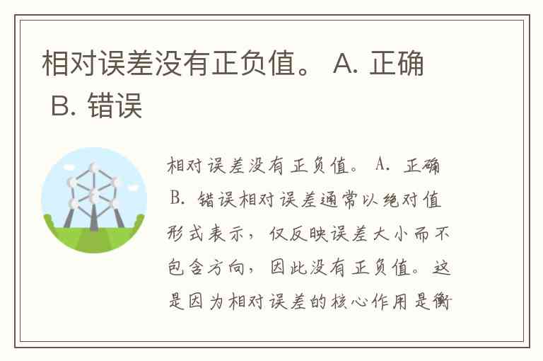 相对误差通常以绝对值形式表示,仅反映误差大小而不包含方向,因此没有正负值。这是因为相对误差的核心作用是衡量测量结果的准确度,关注的是误差与真实值的比例关系而非偏差方向,实际应用中一般通过“相对误差=|绝对误差|/真实值”计算,结果恒为非负数。