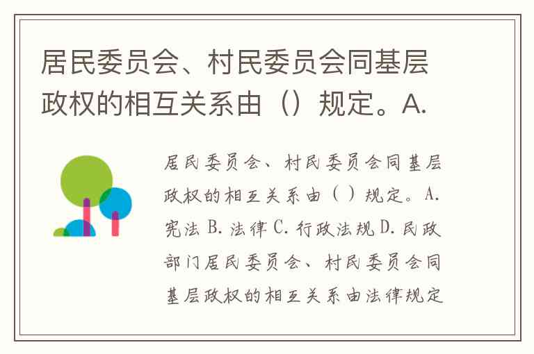 居民委员会、村民委员会同基层政权的相互关系由()规定。A.宪法 B.法律 C.行政法规 D.民政部门