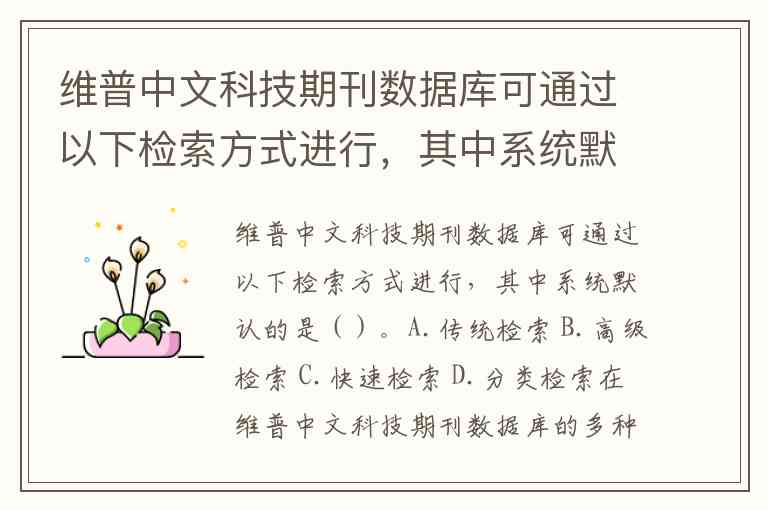 维普中文科技期刊数据库可通过以下检索方式进行,其中系统默认的是()。A.传统检索 B.高级检索 C.快速检索 D.分类检索