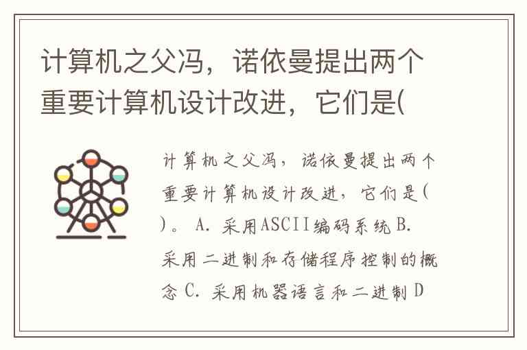 计算机之父冯,诺依曼提出两个重要计算机设计改进,它们是( )。 A. 采用ASCII编码系统 B. 采用二进制和存储程序控制的概念 C. 采用机器语言和二进制 D. 引入CPU和内存储器的概念