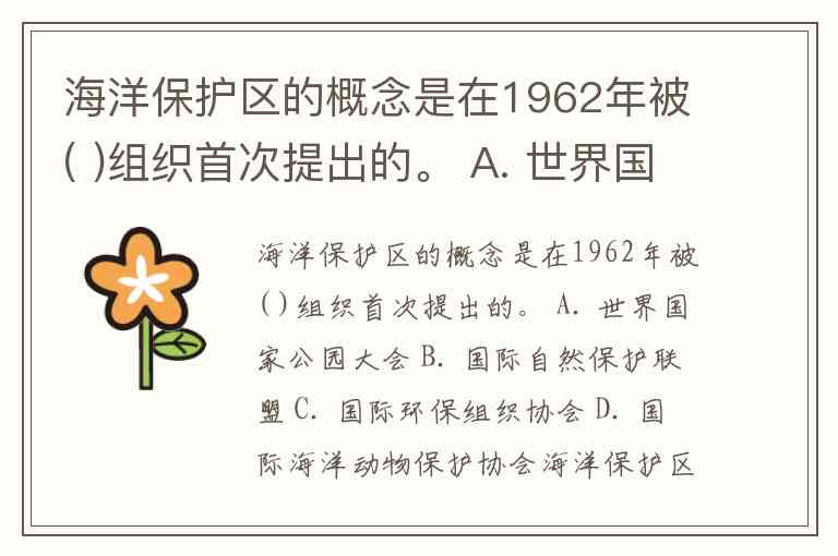 海洋保护区的概念是在1962年被( )组织首次提出的。 A. 世界国家公园大会 B. 国际自然保护联盟 C. 国际环保组织协会 D. 国际海洋动物保护协会