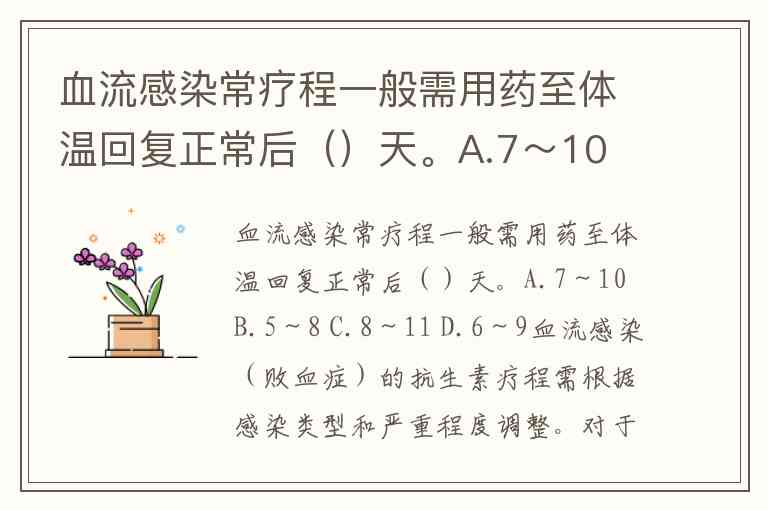 血流感染常疗程一般需用药至体温回复正常后()天。A.7~10 B.5~8 C.8~11 D.6~9