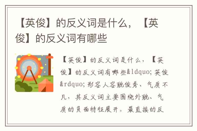 “英俊”形容人容貌俊秀、气质不凡,其反义词主要围绕外貌、气质的负面特征展开。最直接的反义词是“丑陋”,此外还有“难看”“猥琐”“鄙陋”等,具体使用需结合语境侧重。
