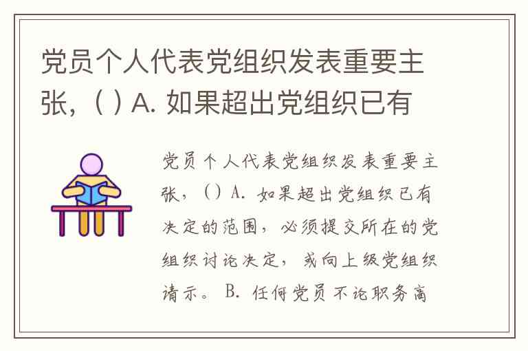 党员个人代表党组织发表重要主张,( ) A. 如果超出党组织已有决定的范围,必须提交所在的党组织讨论决定,或向上级党组织请示。 B. 任何党员不论职务高低,都不能个人决定重大问题 C. 如遇紧急情况,必须由个人作出决定时,事后要迅速向党组织报告 D. 不允许任何领导人实行个人专断和把个人凌驾于组织之上。