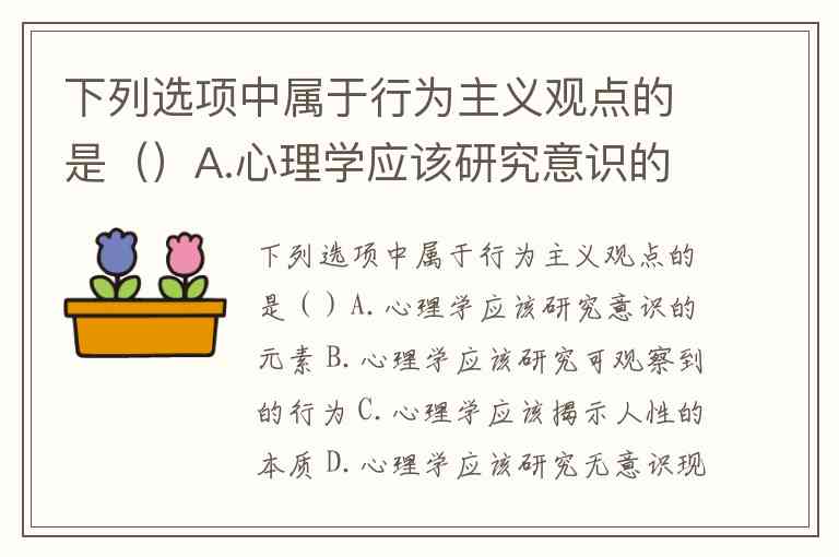 下列选项中属于行为主义观点的是()A.心理学应该研究意识的元素 B.心理学应该研究可观察到的行为 C.心理学应该揭示人性的本质 D.心理学应该研究无意识现象
