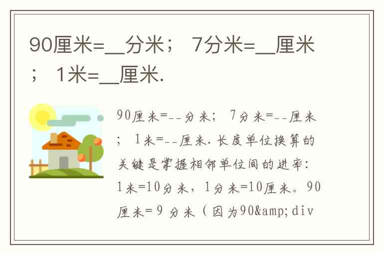 90厘米= 9 分米(因为90÷10=9);7分米= 70 厘米(因为7×10=70);1米= 100 厘米(因为1米=10分米=10×10厘米=100厘米)。